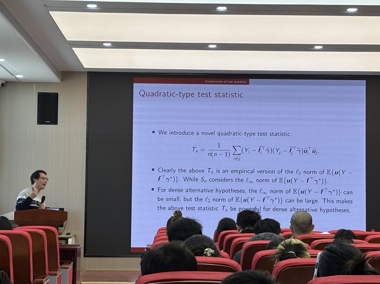 之后,郭老师讨论了检验统计量的理论分析与渐近性质。将检验统计量分解为主项与误差项,并分析了因子估计误差、载荷矩阵估计误差与样本量、维数之间的收敛阶数关系。此外,郭老师阐述了二次型检验统计量的理论性质与功效分析。二次型统计量会随着样本量和维数的增大而趋于无穷大,这从理论上保证了该检验对稠密备择假设的相合性,即能以概率1检测出此类偏离。