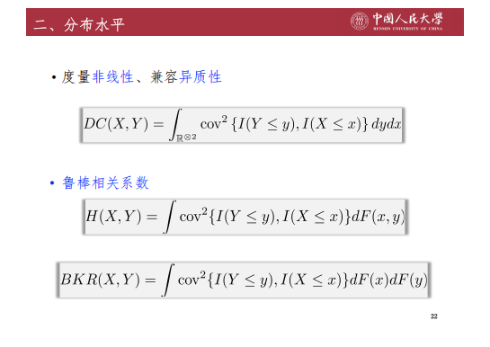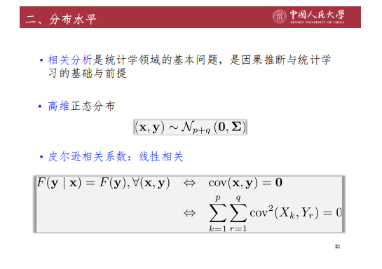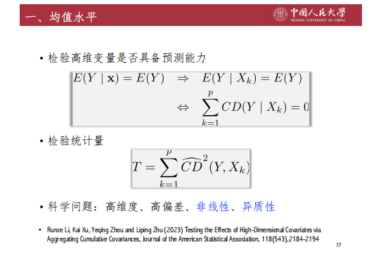 随后,朱老师围绕第二部分内容,聚焦于分布层面的研究。他强调,相关分析作为统计学领域的基本问题,是因果推断与统计学习的基础与前提。朱老师以二元正态分布为切入点,逐步过渡到高维正态分布,详细讲解了皮尔逊相关系数、鲁棒相关系数及其检验统计量的计算方法,并探讨了如何在兼容异质性的情况下有效度量非线性关系。他还结合实际应用场景,分析了在不同条件下高维正态分布的渐近相对功效,展示了相关方法在复杂数据结构中的适用性与稳健性。